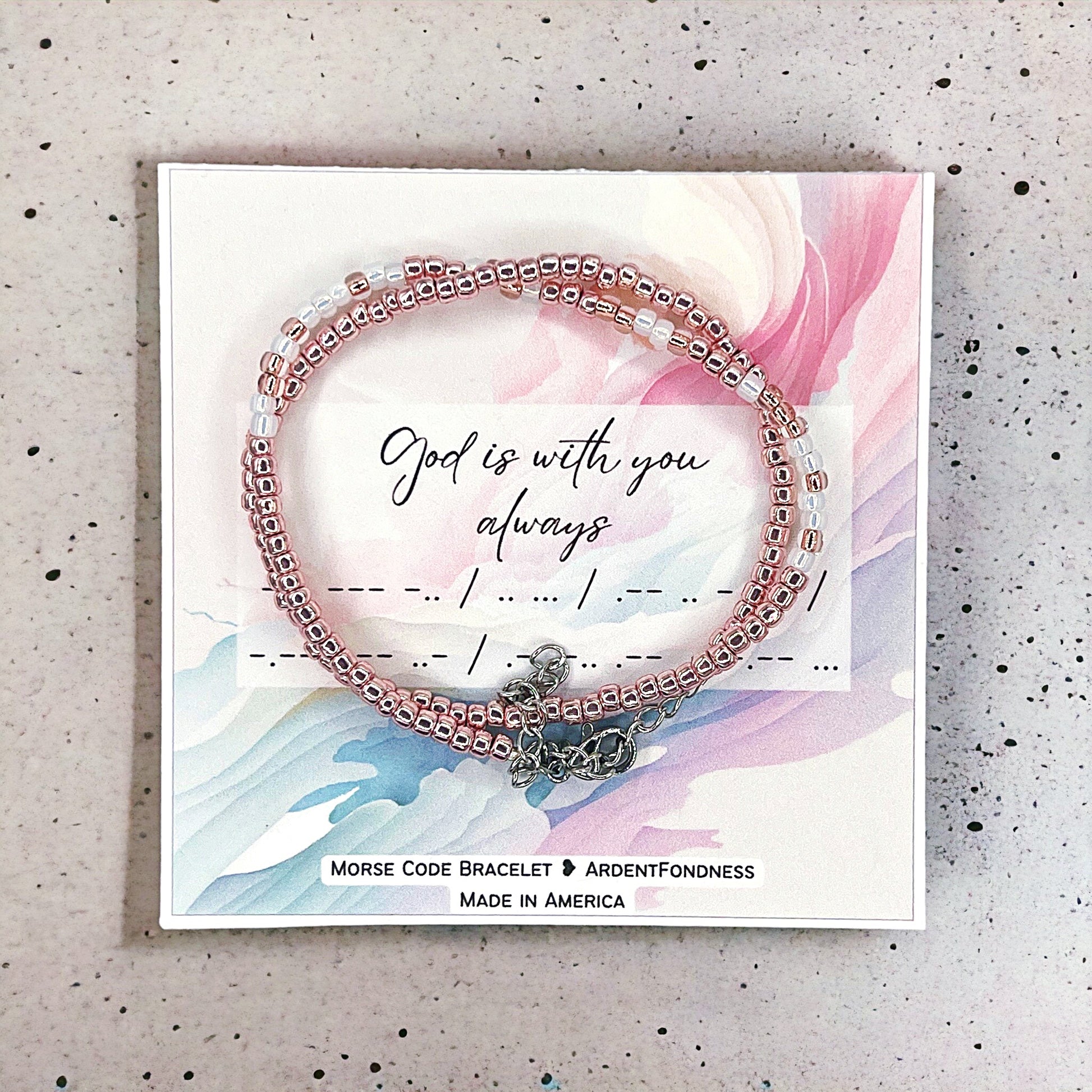 - Bracelet features a message in morse code and comes with a card with the message in English and Morse Code