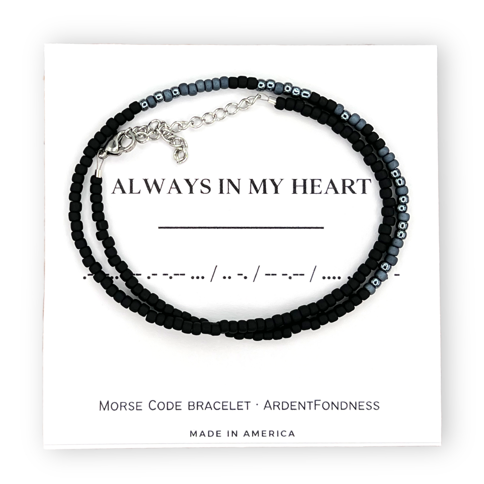 - Bracelet features a message in morse code and comes with a card with the message in English and Morse Code