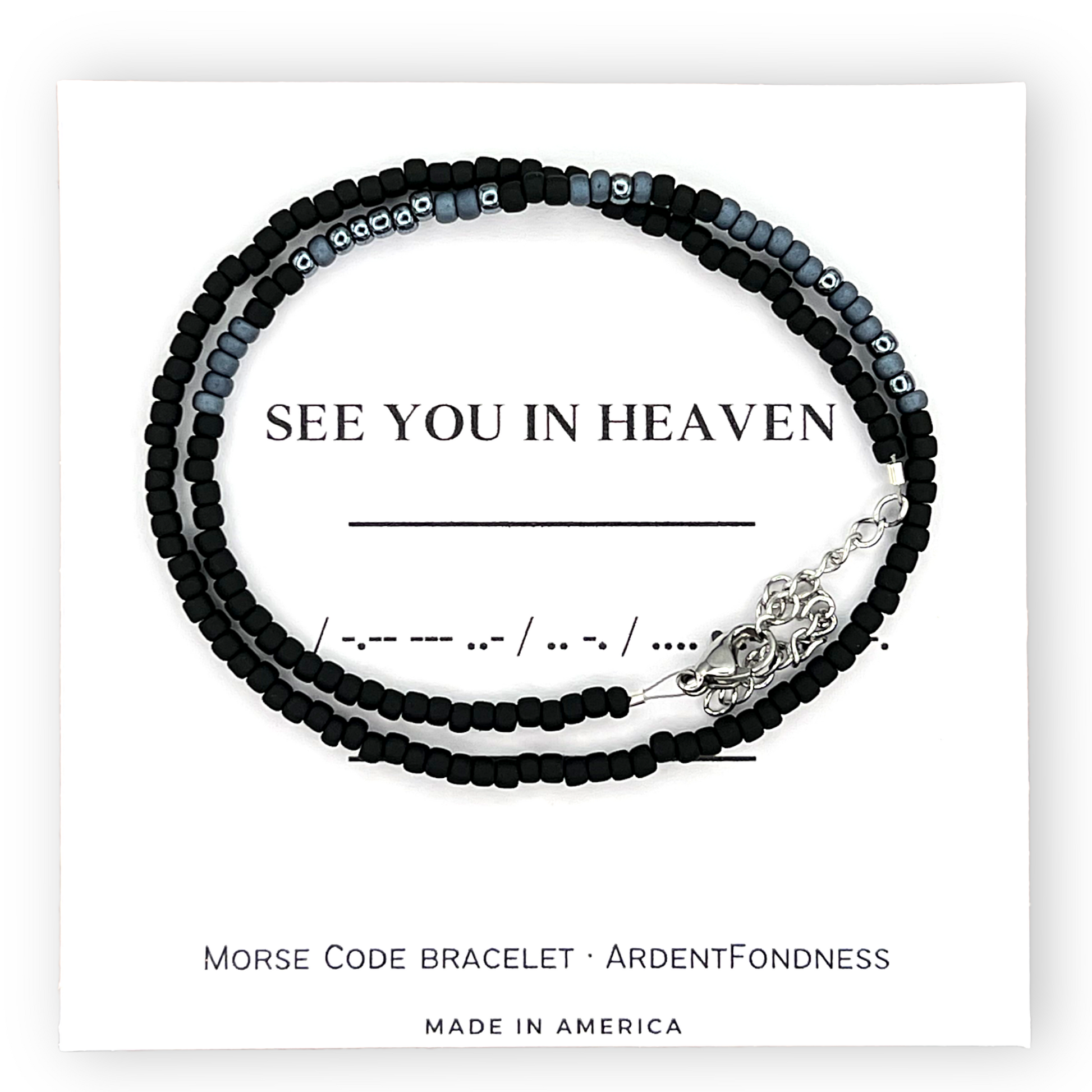 - Bracelet features a message in morse code and comes with a card with the message in English and Morse Code